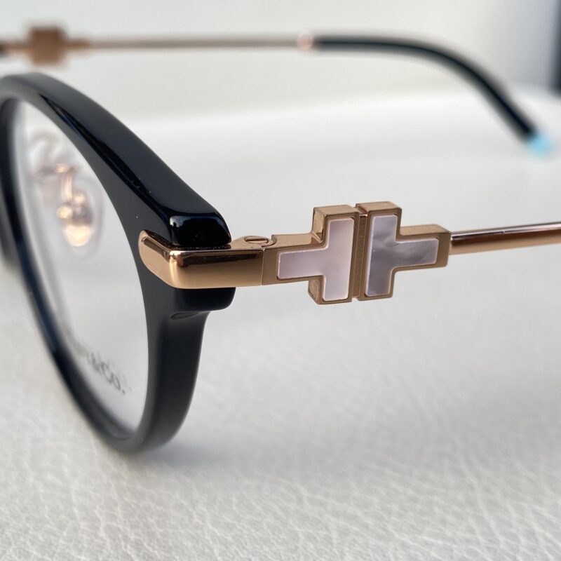 ティファニーの代表的なモチーフとも言える「ティファニーT」が使用されたモデルで、テンプルには白蝶貝のような煌めきを放つワンポイントが使用されています。