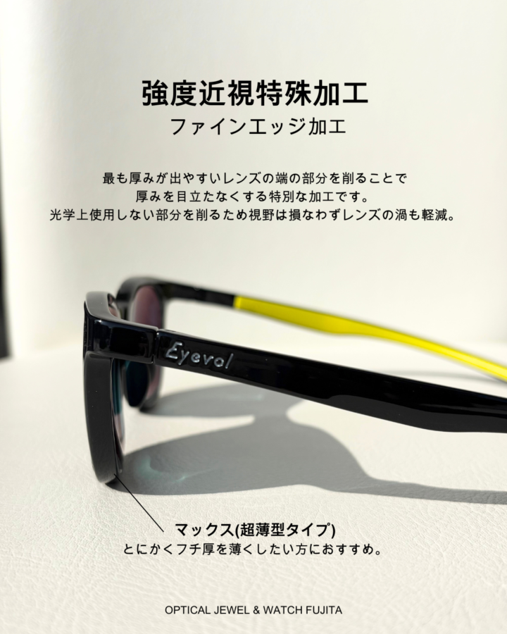 強度近視の縁厚を極限まで薄くする「ファインエッジ加工」により、レンズの厚みと輪郭の入り込みを最小限にしています。